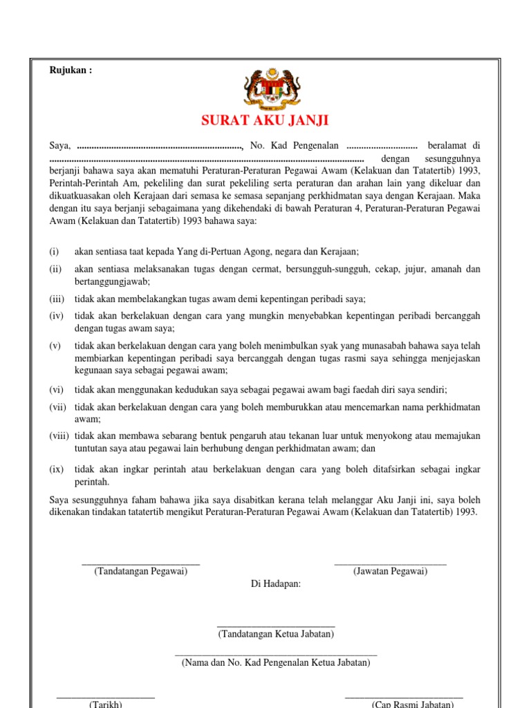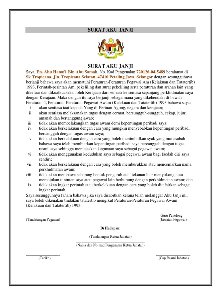 Contoh surat aku janji saya sesungguhnya faham bahawa jika saya disabitkan kerana telah melanggar aku janji ini saya boleh dikenakan tindakan tatatertib mengikut peraturan peraturan. __________________________________________________________________________________ surat akujanji perjanjian jaminan berkelakuan baik bahawa saya. Maka dengan itu saya berjanji sebagaimana yang dikehendaki di bawah Peraturan 4.
